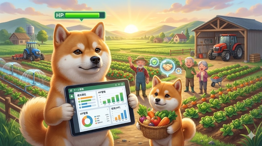 新規就農シリーズ第10話:再起不能になるまで頑張るな。綺麗にこける準備が農業と人生を救う、というメッセージを柴犬キャラクターが畑で語るアイキャッチ画像