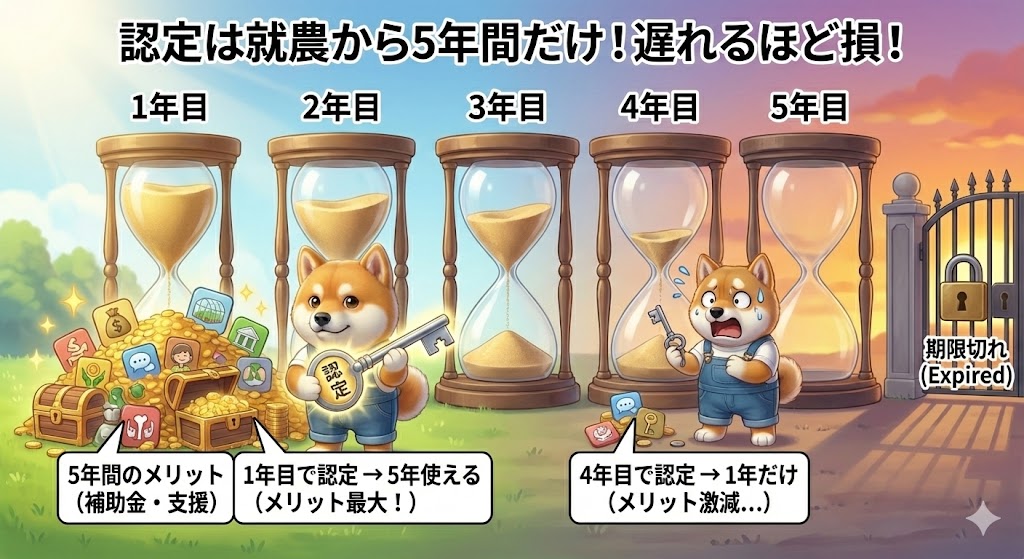 - 認定は就農から5年間だけ