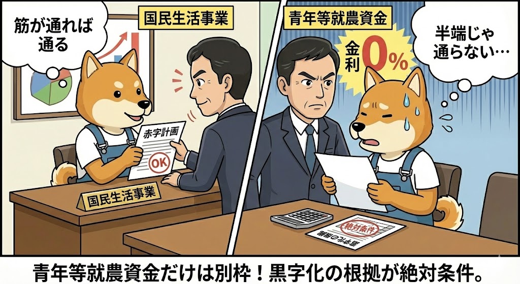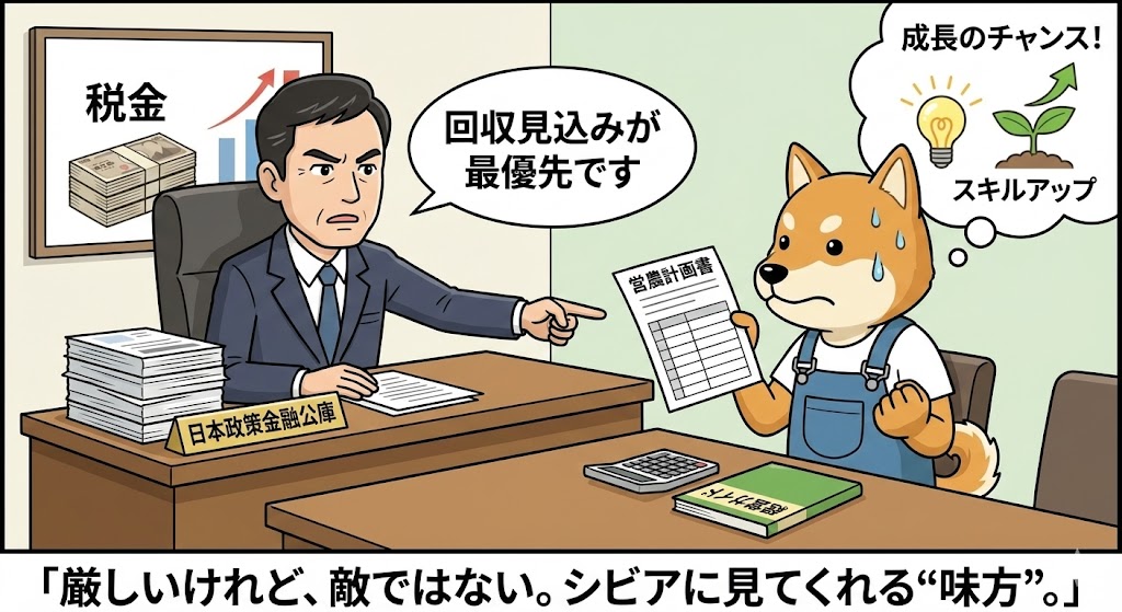 【新規就農シリーズ 第5話】公庫は応援ではなく経営力チェック。就農資金は簡単ではなく、厳しいけれど味方という現実を表したイラスト。