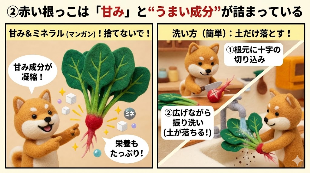 ② 赤い根っこは「甘み」と“うまい成分”が詰まっている