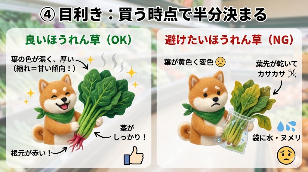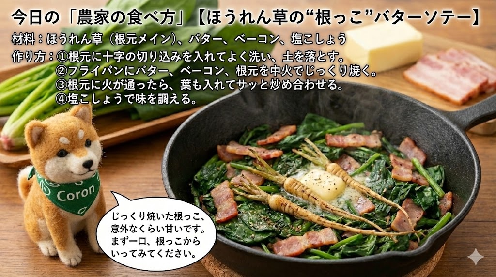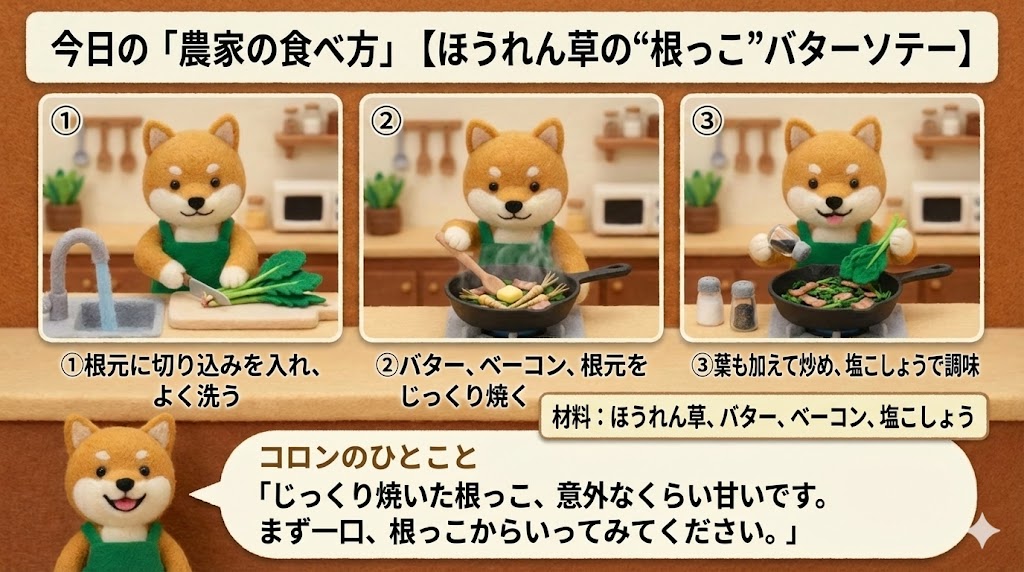 今日は、冬のほうれん草が甘くなる「理屈」と、赤い根っこの正体、そして長持ち保存の話です。