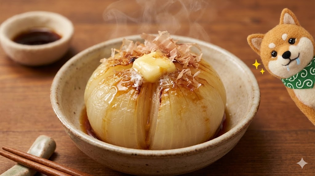 • 材料:玉ねぎ1個、バター1かけ、ポン酢(or麺つゆ)、かつお節