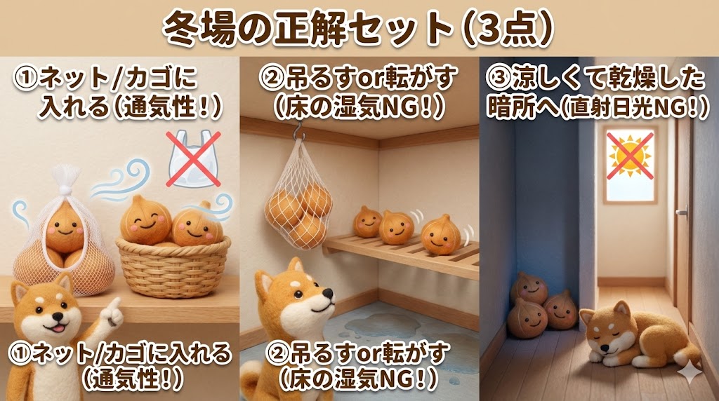 これ、玉ねぎが弱いのは温度よりも――たいてい**“湿気”**です。